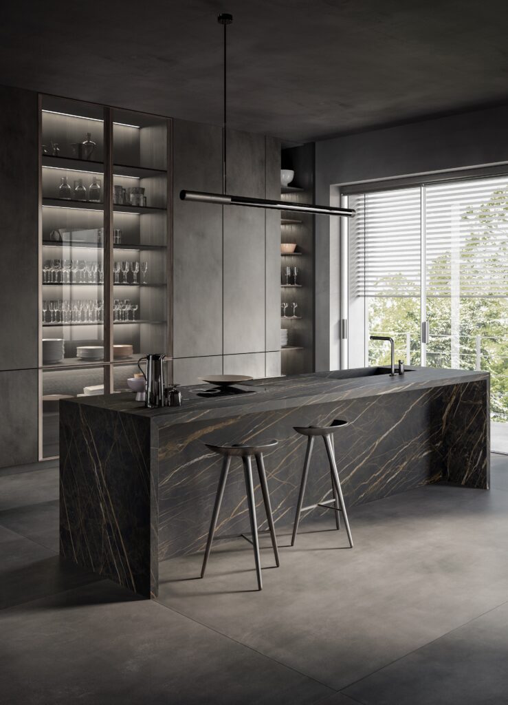 Noir Desir brings a touch of refined marble elegance to interior design, featuring dark tones with soft ivory veining. Inspired by classic Italian architecture, it blends rich aesthetics with Laminam’s advanced technology for a luxurious, modern finish. Available in natural, bush hammered and polished finishes.
