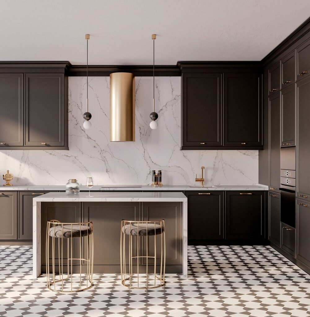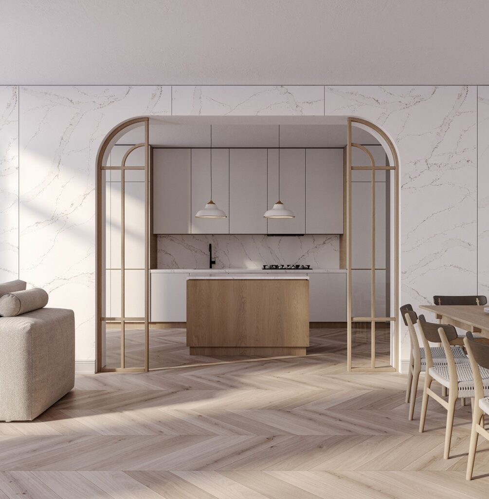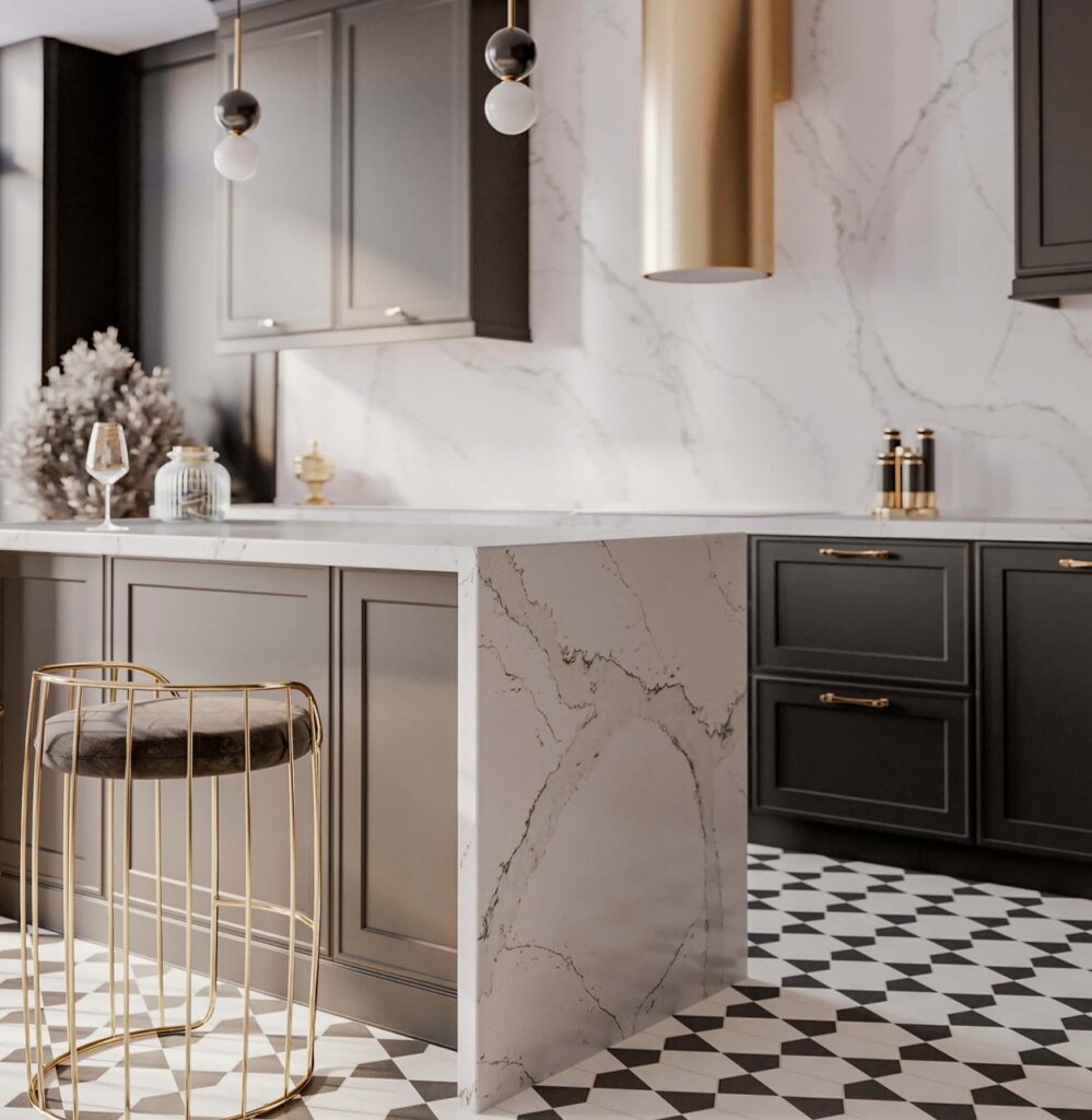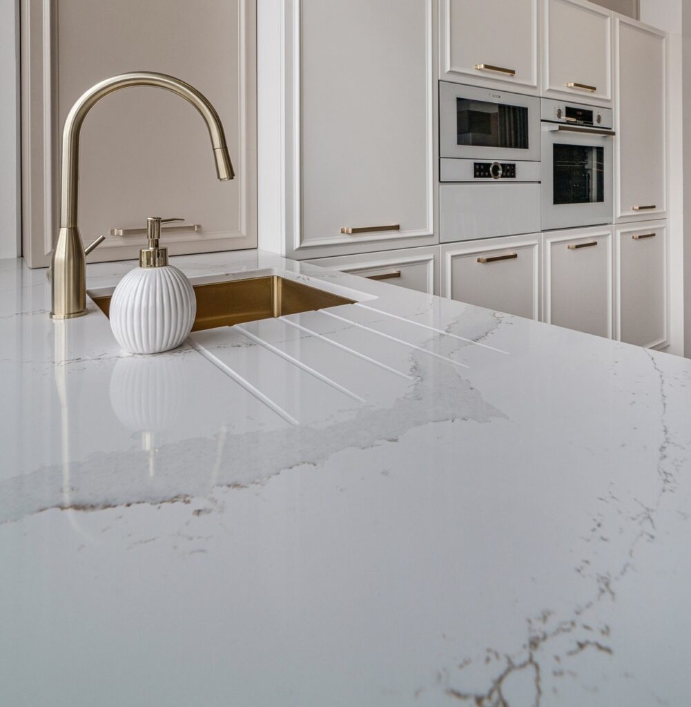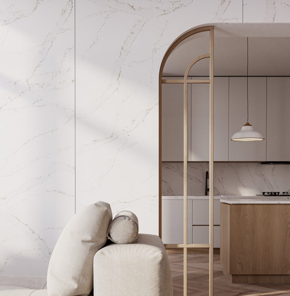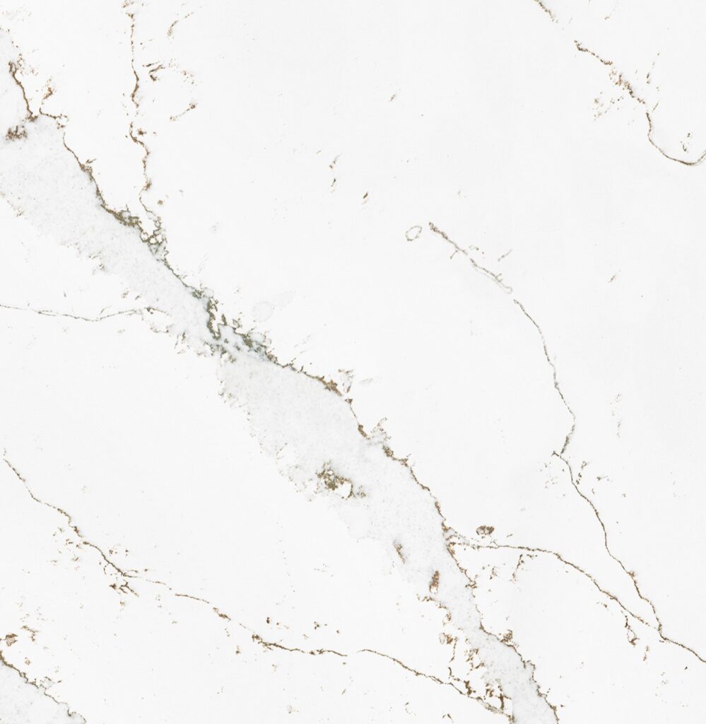 Technistone Calacatta Volegno is a high-quality engineered quartz stone from the Wilsonart Collection. Its bright white base is enriched with expressive golden and brown-toned veining, creating a luxurious marble-inspired design with a natural and artistic character. The pattern reflects the contours of Italian landscapes, combining bold and subtle strokes into a visually striking surface.