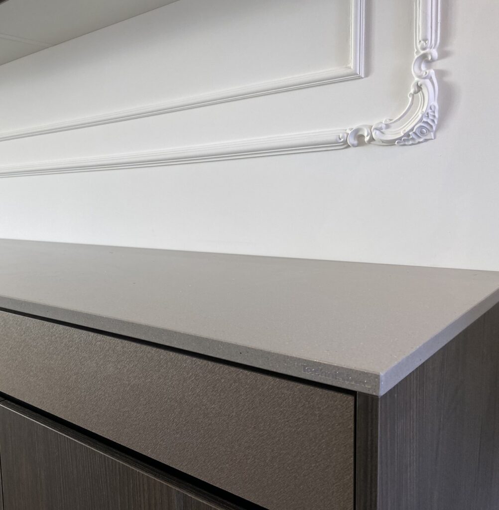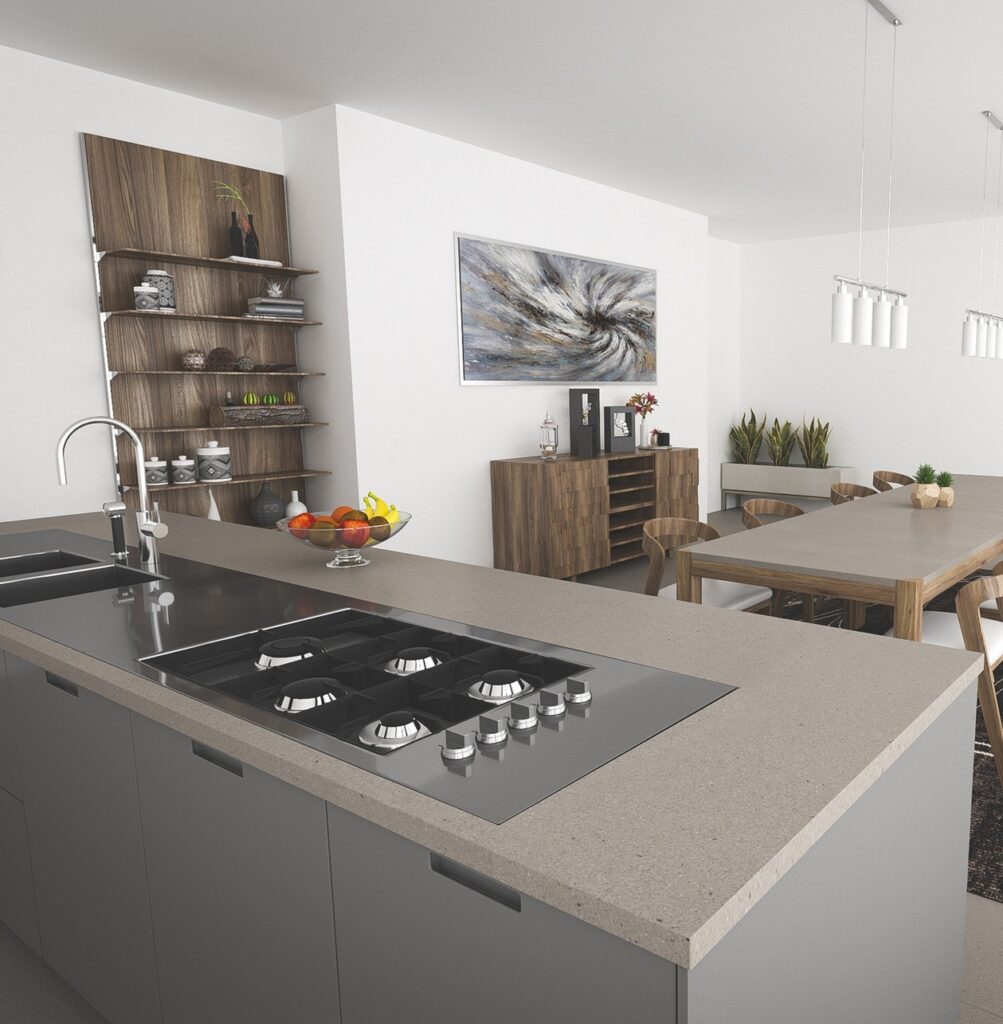 Technistone Gobi Urban is a high quality engineered quartz surface from the Standard Collection. It features a sophisticated grey base with a fine grained structure enriched by subtle white and translucent quartz particles, creating a modern and urban inspired appearance.