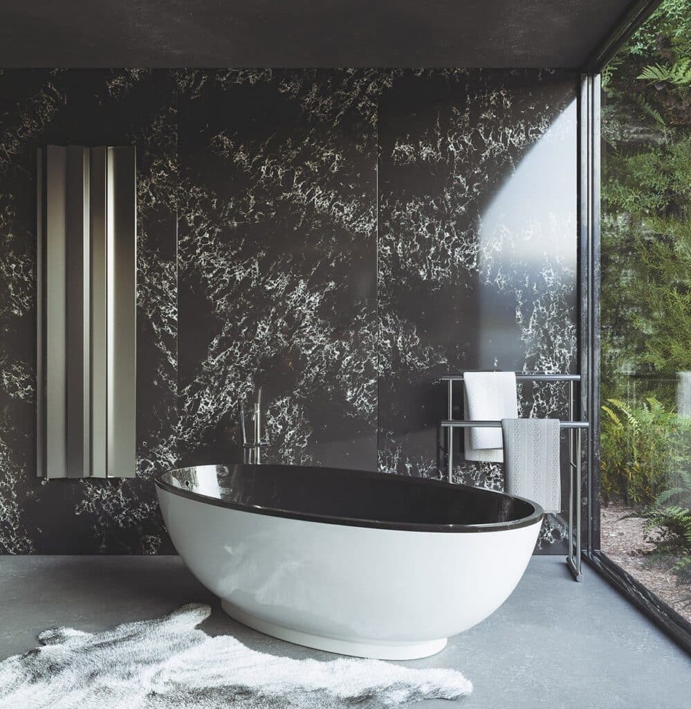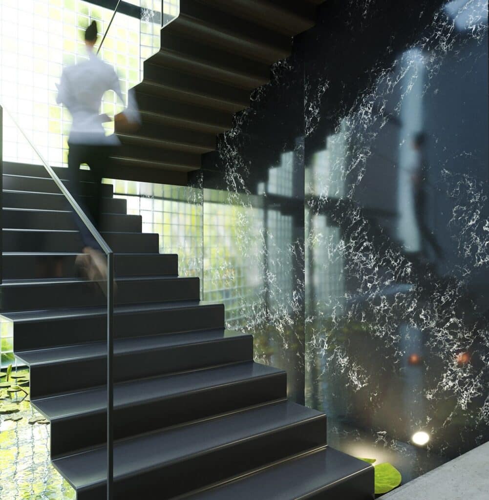 Its expressive full slab design gives the surface a luxurious and architectural character, making it an ideal choice for statement interiors where elegance and individuality are equally important. The dynamic pattern creates depth and contrast while maintaining a sophisticated and timeless aesthetic.