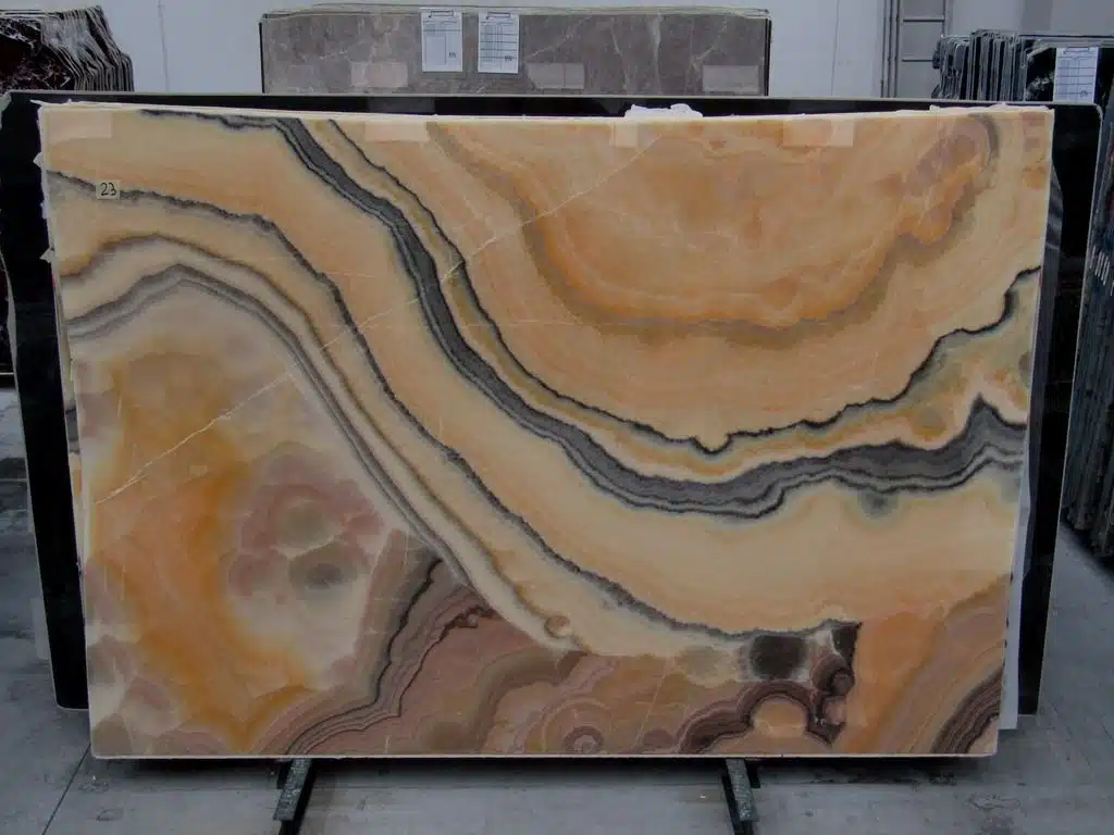 Onice Arco Iris on poollabipaistev vikerkaarevarviline oniksist kivi, mida kaevandatakse Iraanis. Iga plaat on ainulaadne, kandtes enda sees oranzi, rohelise, kreemika ja roostekarva joonte mustrit. Kivi poollabipaistevus lubab valgust labi, luues luksusliku sooniva efekti.